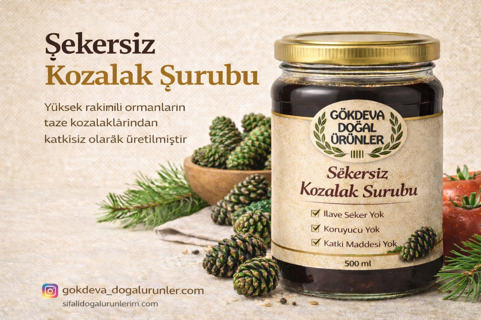 Şekersiz kozalak şurubu, yüksek rakımlı ormanların taze kozalaklarından elde edilerek geleneksel yöntemlerle hazırlanmıştır. Ürünümüzde ilave şeker, katkı maddesi ve koruyucu bulunmaz. Doğal yapısı korunarak üretilmiş olup sade ve yoğun kıvamlıdır.