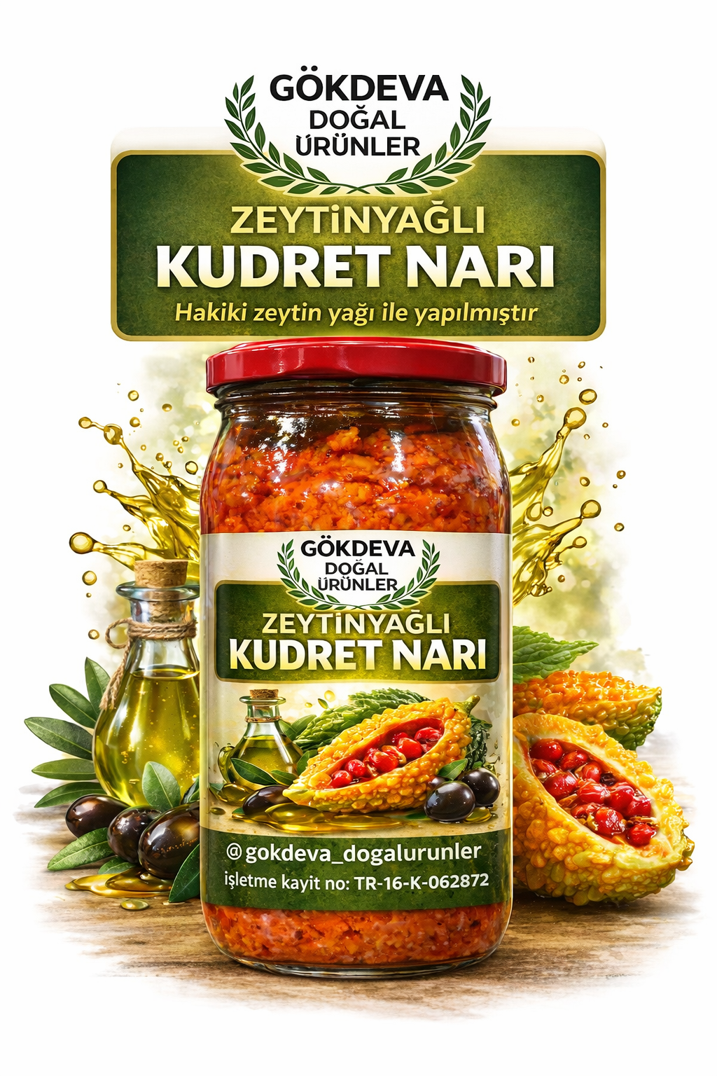 Zeytinyağlı kudret narı, kudret narı meyvesinin %100 doğal ve hakiki zeytinyağı içerisinde bekletilmesiyle geleneksel yöntemlerle hazırlanmıştır. Katkı maddesi, koruyucu ve yapay aroma içermez.